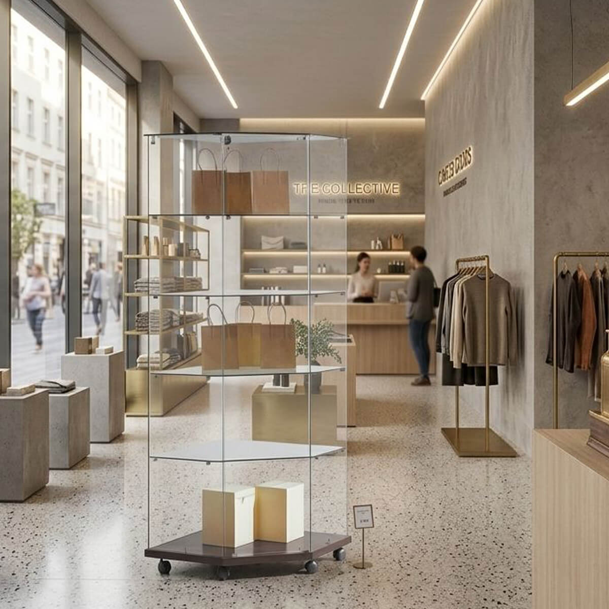 - Die Glasvitrine ist mit fünf Rollen ausgestattet, wodurch sie mobil ist und sich ideal für die Ausstattung Ihres Ladens eignet.