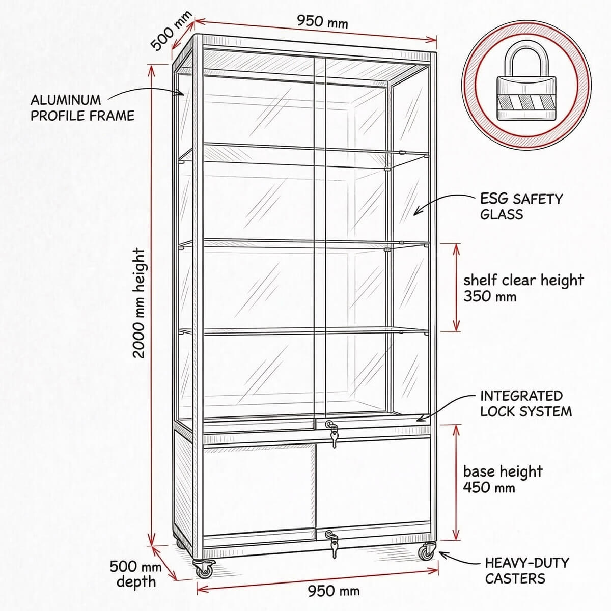 Präsentieren Sie Ihre Produkte stilvoll und sicher. Unsere Glasvitrine mit Schiebetür und integriertem Unterschrank ist die ideale Lösung für den professionellen Einzelhandel, Ausstellungen oder anspruchsvolle Sammlungen. Erfahren Sie hier, warum dieses Modell die perfekte Wahl für Ihre Verkaufsräume ist: