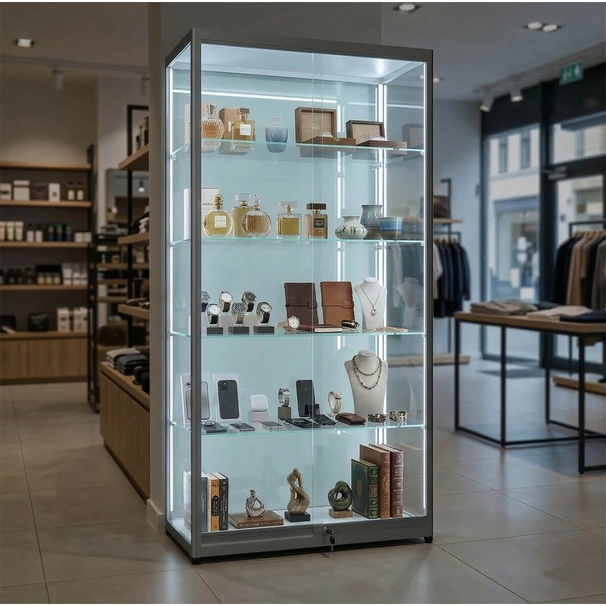 Eine Glasvitrine mit Schiebetüren und LED-Beleuchtung kombiniert elegantes Design, effektive Beleuchtung und Schutzfunktionen. Sie ist eine beliebte Wahl für Unternehmen, Sammler und Ausstellungsorte, die eine hochwertige und moderne Präsentationslösung suchen.
