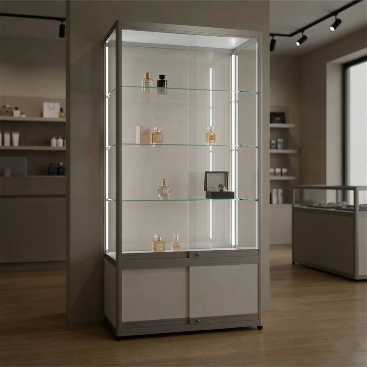 Eine Glasvitrine Turm mit Schiebetüren, Unterschrank und LED-Beleuchtung kombiniert Ästhetik, Funktionalität und Schutz für eine optimale Präsentation von Gegenständen. Mit ihrer stilvollen Optik, der effektiven Beleuchtung und dem zusätzlichen Stauraum ist sie eine beliebte Wahl für Unternehmen, Ausstellungsstätten oder Sammler, die eine hochwertige Präsentationslösung suchen.