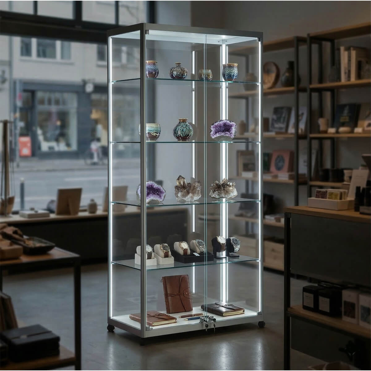 Die zweitürige LED-Glasvitrine ist die Premium-Lösung für alle, die Wert auf eine verkaufsfördernde und sichere Objektpräsentation legen. Sie vereint Schutz mit brillanter Optik und sorgt für eine nachhaltige, kosteneffiziente Beleuchtung Ihrer Ausstellungsstücke.