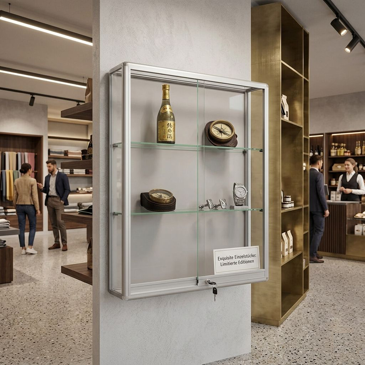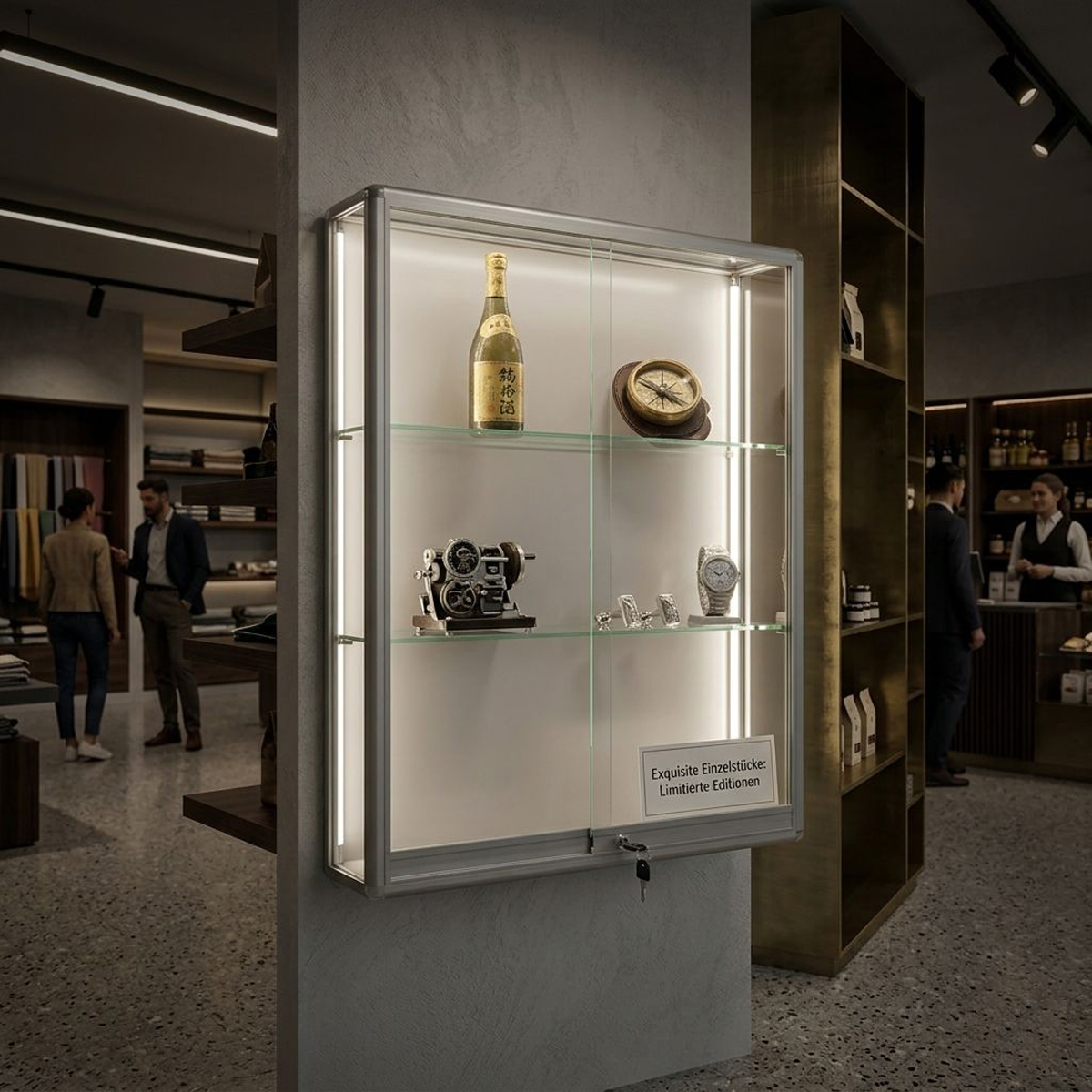 Die Glasvitrine Wand mit LED-Beleuchtung bietet eine attraktive und platzsparende Lösung zur Präsentation von Gegenständen. Mit ihrer stilvollen Optik, der effektiven Beleuchtung und der Schutzfunktion ist sie eine beliebte Wahl für Unternehmen, Ausstellungsstätten oder Sammler, die eine hochwertige und moderne Präsentationslösung an der Wand suchen.