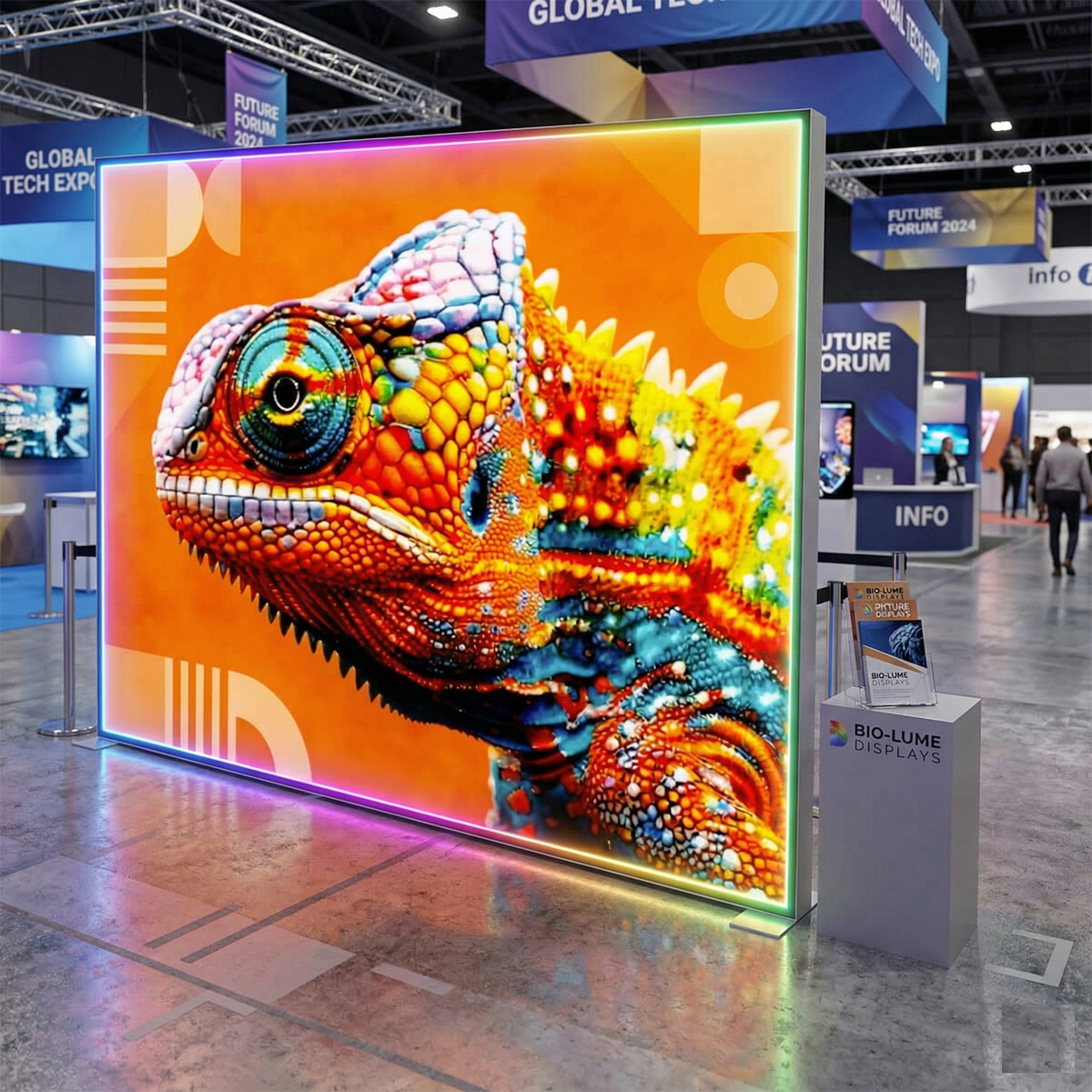 Unser Werbedisplay kombiniert brillante LED-Hinterleuchtung mit einem spektakulären RGB-Neon-Effekt an den Kanten.