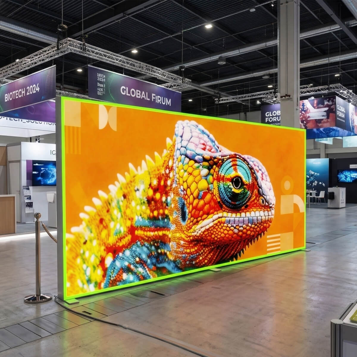Diese moderne LED-Messewand kombiniert zwei eindrucksvolle Lichtquellen: eine gleichmäßige LED-Hinterleuchtung der Grafik sowie einen auffälligen RGB-Neonrahmen. Durch diese besondere Lichtkombination wird Ihre Werbebotschaft optimal hervorgehoben und gleichzeitig eine dynamische, aufmerksamkeitsstarke Präsentation geschaffen. Das Ergebnis ist eine moderne Lichtinszenierung, die Ihrem Messestand einen einzigartigen und futuristischen Charakter verleiht.