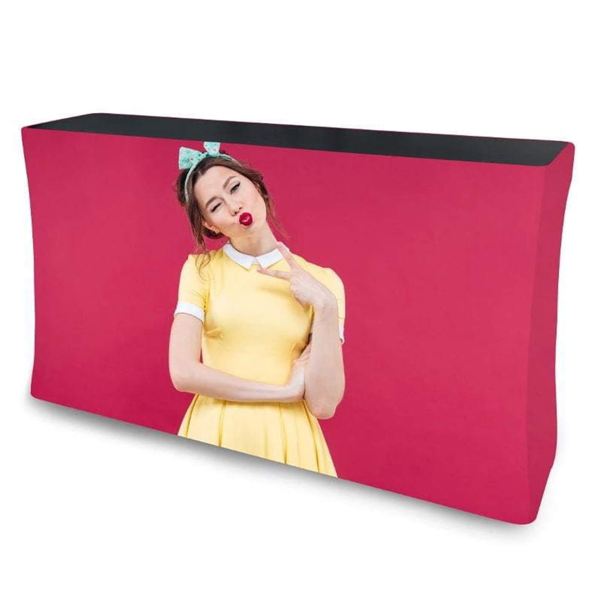 2. Textiles Druckmaterial: Anstelle von starren Paneelen besteht die Messetheke BIG aus einem bedruckten Textilbanner oder einer Stoffverkleidung, die um das Gestell gespannt wird. Dies ermöglicht eine nahtlose und ansprechende Präsentation.