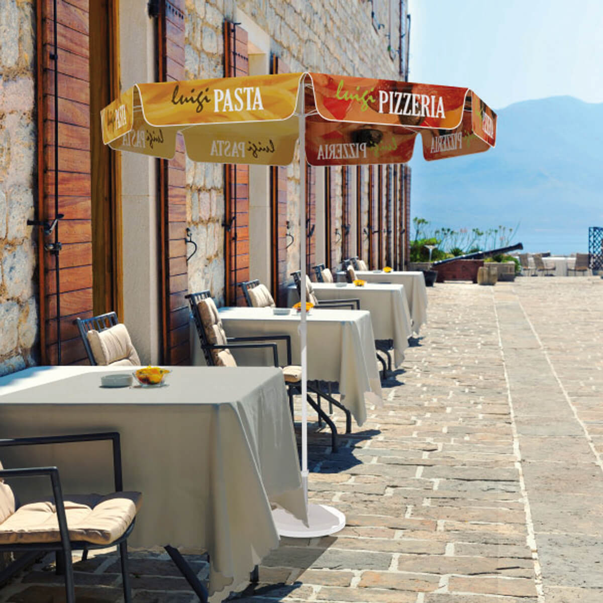 - Anwendungsbereiche: Bedruckte Sonnenschirme finden in verschiedenen Anwendungsbereichen Verwendung, wie z. B. in Restaurants, Cafés, Hotels, Strandclubs, Veranstaltungen im Freien, Märkten und anderen öffentlichen oder kommerziellen Orten. Sie dienen als effektives Werbemittel und bieten gleichzeitig Schutz vor Sonneneinstrahlung.